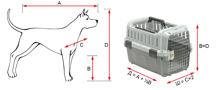 Щоб визначитися з правильним розміром переноски, треба провести кілька вимірів улюбленця. Вимірювання собаки роблять у природному положенні стоячи (див. малюнок): А – довжина тварини від кінчика носа до основи (кореня) хвоста. В – висота від підлоги до верхньої частини передньої ноги або ліктьового суглоба. С – ширина плечей або ширина найширшої частини тулуба. D – висота тварини в природному положенні стоячи від верху голови або кінчиків вух до підлоги.